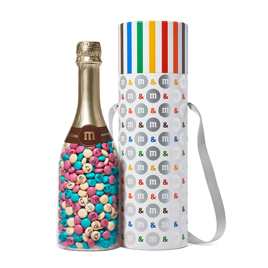 A cheerful, customizable M&M’s gift bottle filled with candy-coated chocolate fun.