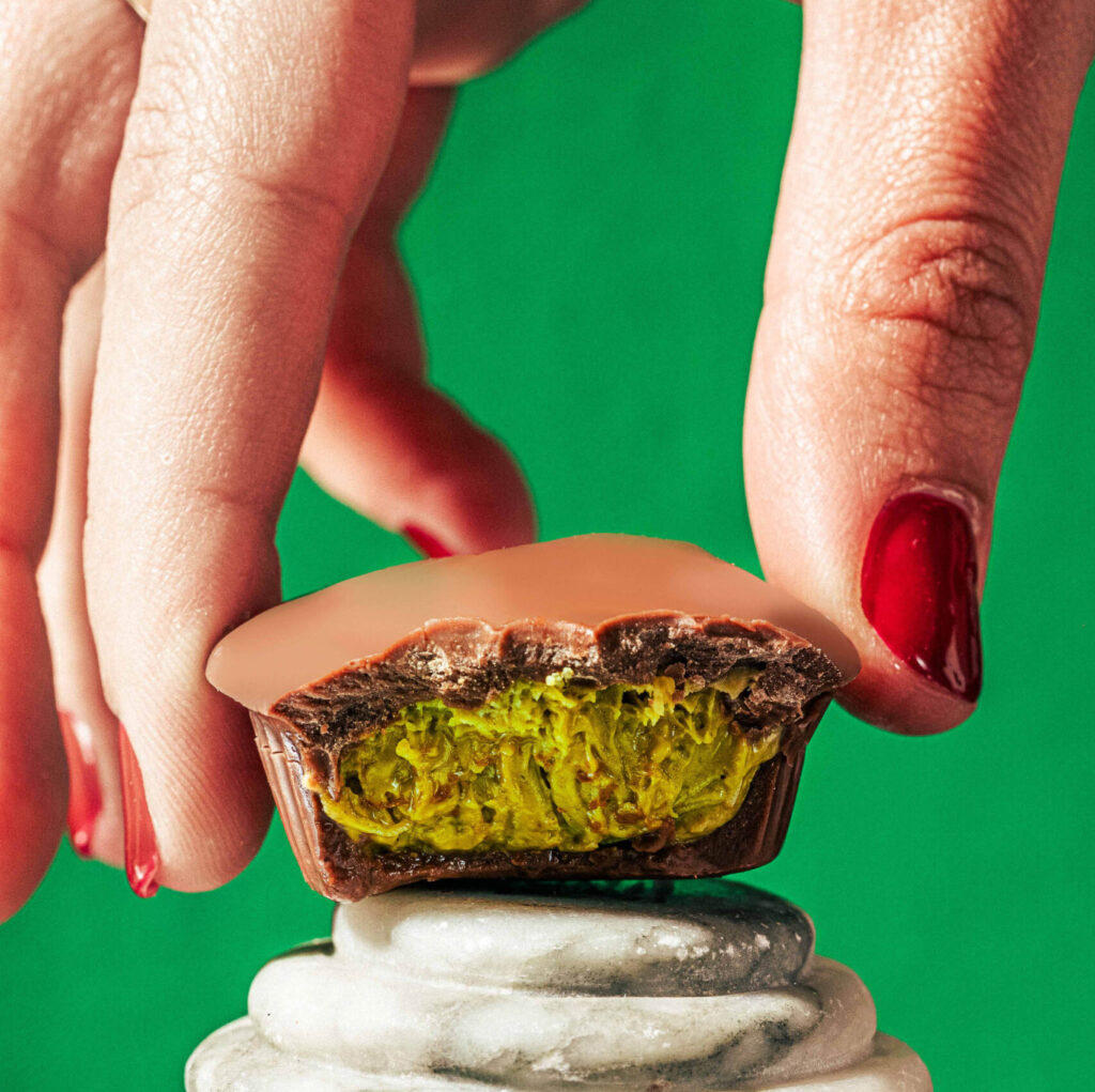 An exotic blend of chocolate, pistachio, and Middle Eastern-inspired knafeh in elegant bite-sized cups.