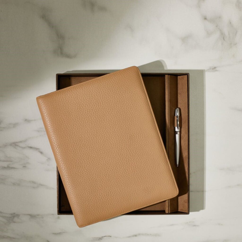 An elegant leather padfolio paired with thoughtful accessories, ideal for note-taking and polished meetings.